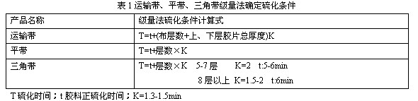 用_量法制定運(yùn)輸帶、平帶、三角帶等產(chǎn)品方面早有成熟的經(jīng)驗(yàn)式(表1)。在50年代我們常用每毫米1.5-2.5分估算外胎的正硫化時(shí)間,由于技術(shù)條件不同(配方、骨架材料、硫化外壓溫度、過(guò)熱水溫度、水胎厚度、硫化方式)再加上人的經(jīng)驗(yàn)上的差異,估算外胎的正硫化時(shí)間誤差較大。