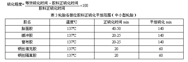5、胎面硫化程度應(yīng)控制160%,輪胎生產(chǎn)質(zhì)量才能穩(wěn)定,硫化平坦范圍如(表3)。