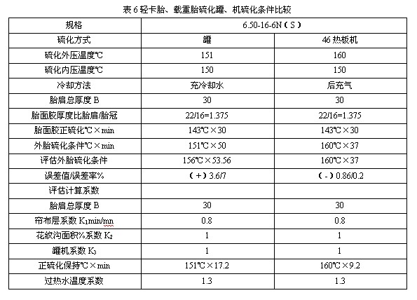 用級(jí)量法評(píng)估計(jì)算外胎硫化條件。輕卡胎、載重胎(表6),工程胎、農(nóng)業(yè)胎(表7)外胎硫化條件誤差率多數(shù)5%以下,證明方法基本可行。建議采用系數(shù)(表8)。