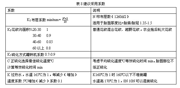 T:外壓正硫化時(shí)間min;B:胎肩厚度;K1:簾布層數(shù)系數(shù)(min/mm);K2:胎面花紋溝面積修正系數(shù);K3:硫化罐機(jī)修正系數(shù);C:胎面膠正硫化等效時(shí)間(min);K:內(nèi)壓過(guò)熱水溫度修正系數(shù)